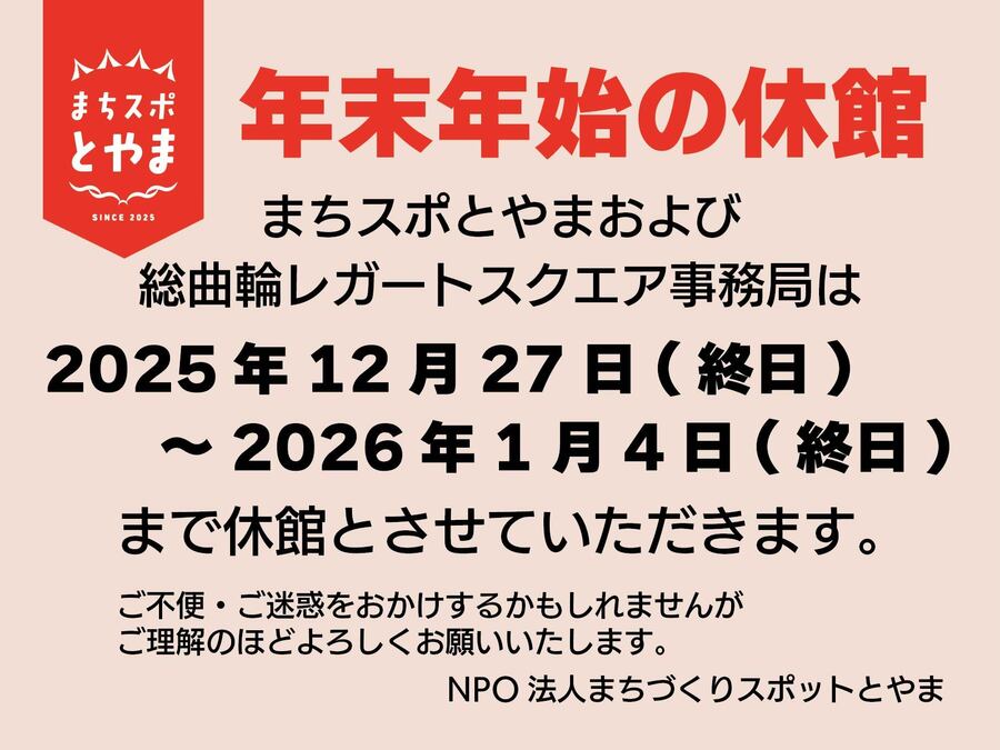 まちスポとやまは、2025年12月27日~2026年1月4日まで休館とさせていただきます。